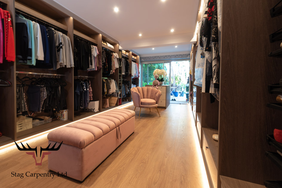 Early Spring 2020, From a bare room to this quite remarkable, glossy walk in wardrobe. Designed and built here at Stag Builders Ltd we created ample space for all the clothing and shoes you could ever need. Built in units from floor to ceiling, with ebony frames, cashmere frontals and finished with Swarovski handles really set this area off. Shoe storage for 160 pairs and hanging rails suited to the client's needs made this build completely bespoke. Storage solutions all the way with this one, integrated shelving, 22 drawers, double/single hanging and a gondola island to boot. Great place to relax, cat walk the special occasion and store all your designer wears.
